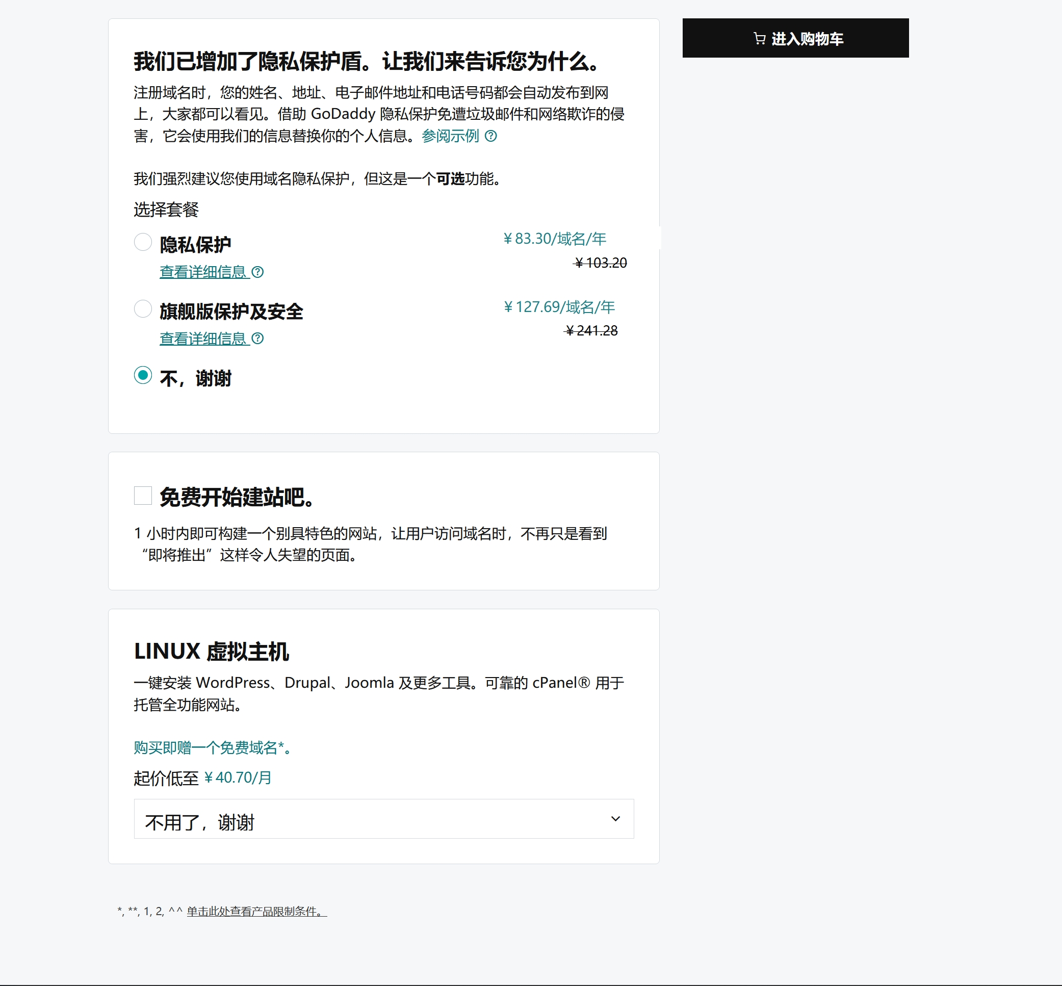 注册GoDaddy和CloudFlare需要邮箱。特别注意,购买域名之后,域名服务商会公开邮箱地址。建议至少使用gmail注册,如果对隐私有较高要求,可以用Protonmail等匿名邮箱注册。