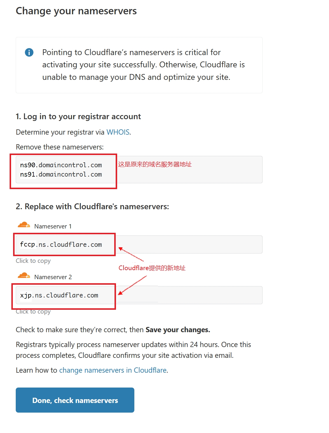 接下来Cloudflare会提示你变更域名服务器,并给出了方法。