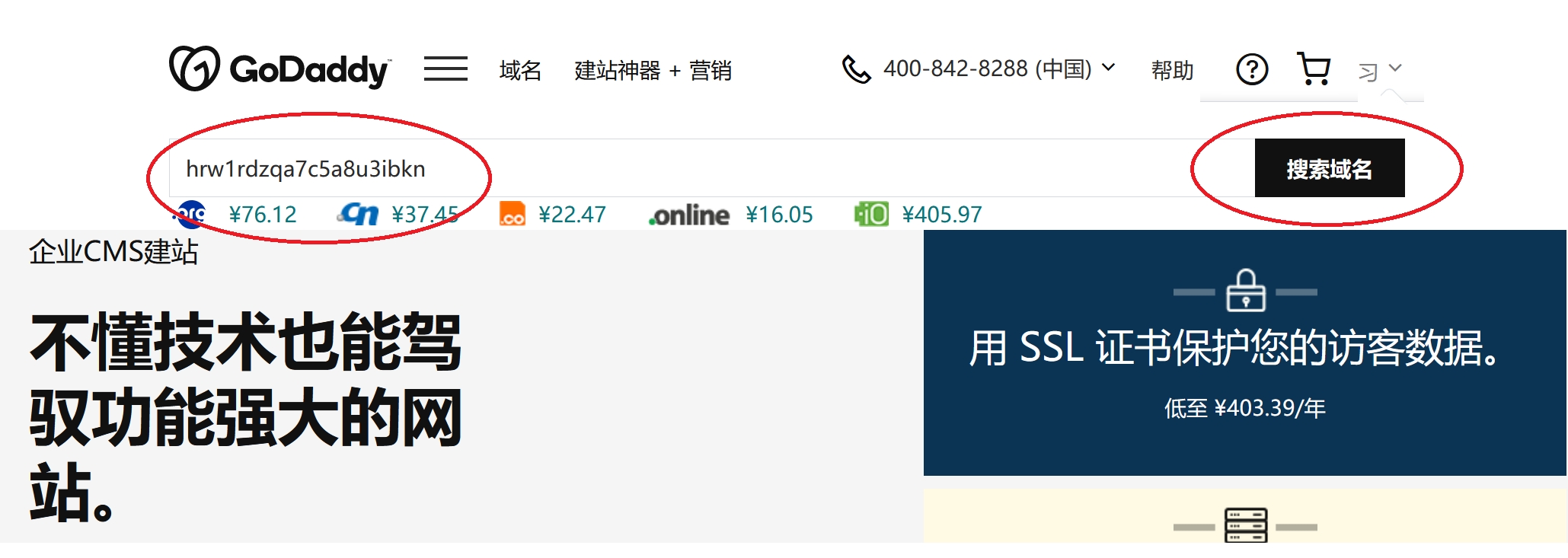 GoDaddy和淘宝的用法完全一样。注册完成以后,回到GoDaddy首页。点击搜索框,输入一个你想要的域名,查询价格。GoDaddy会根据域名包含的词汇定价,为了降低成本,域名尽量选得随机一些,其中不要包含任何单词,我这里头滚键盘输入hrw1rdzqa7c5a8u3ibkn。