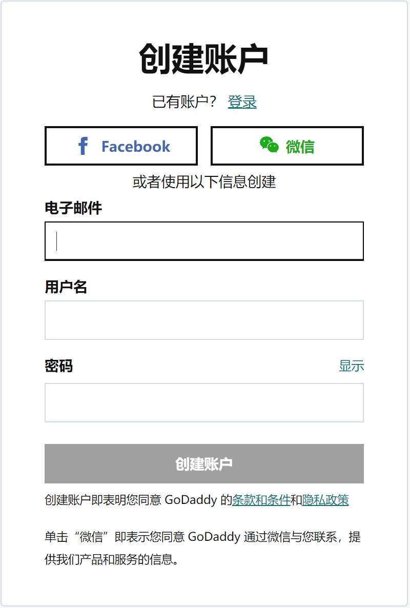 点击这里进入GoDaddy的新加坡官网,全过程都有中文界面。出于安全考虑,选择邮箱注册。