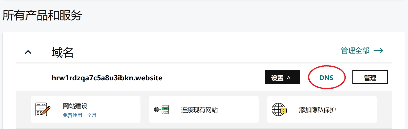 这里可以看到你拥有的域名,点击域名旁边的【DNS】,进入DNS管理页面。